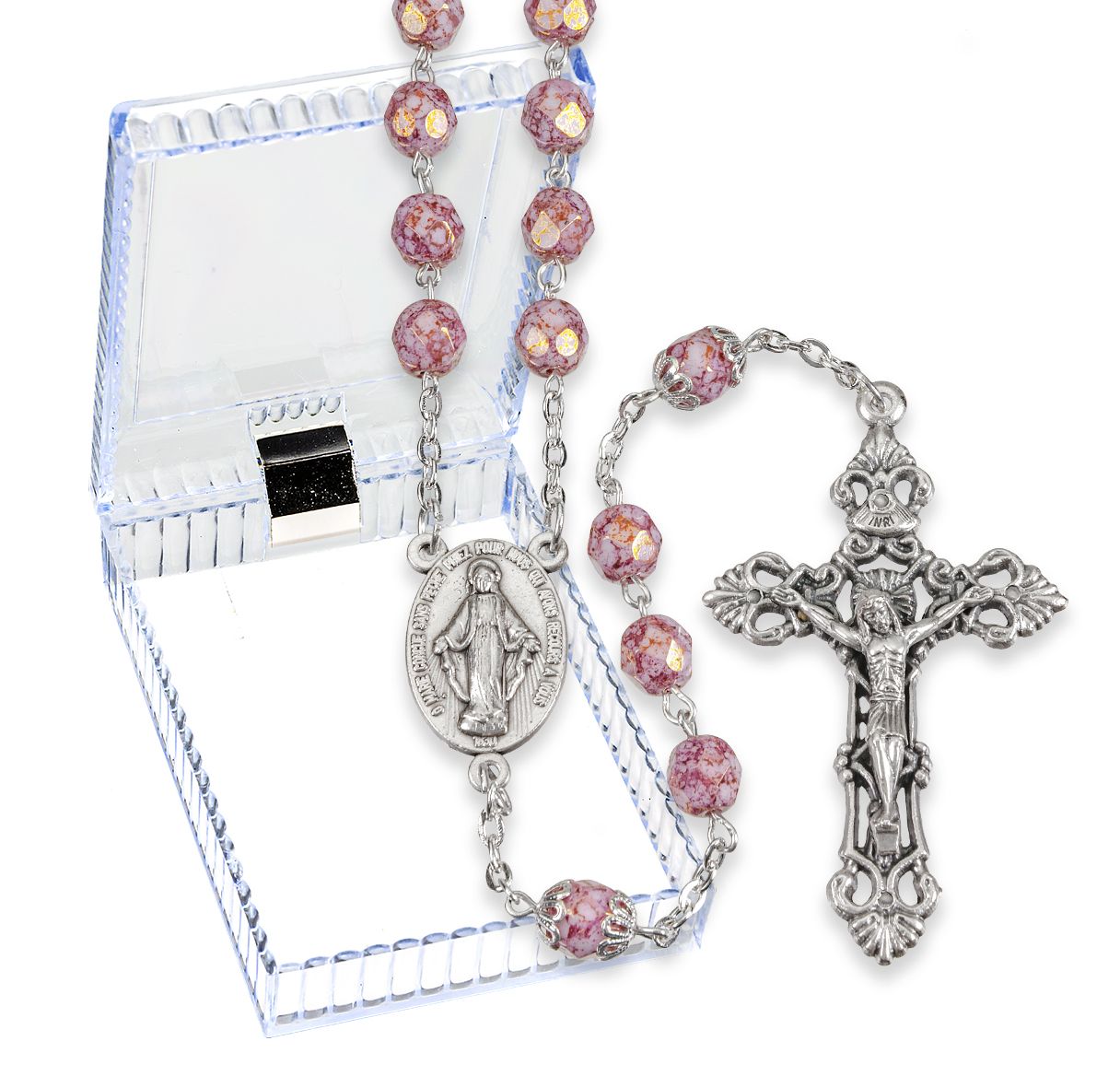 7mm Pink Alabaster Luster Glass Bead Rosary, Boxed