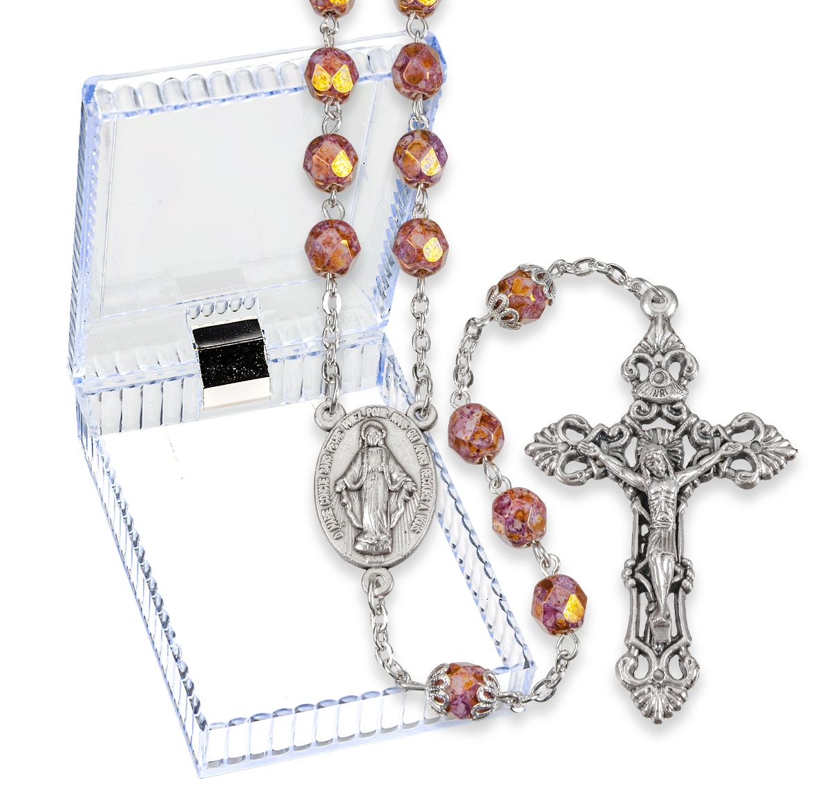 7mm Bronze Alabaster Luster Glass Bead Rosary, Boxed