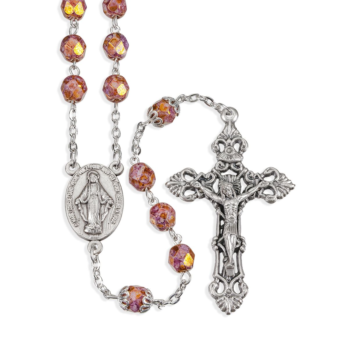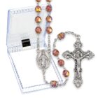 - 7mm Faceted Bronze Alabaster Luster Glass Fire Polished Bead Rosary with Double Capped Our Father Beads.