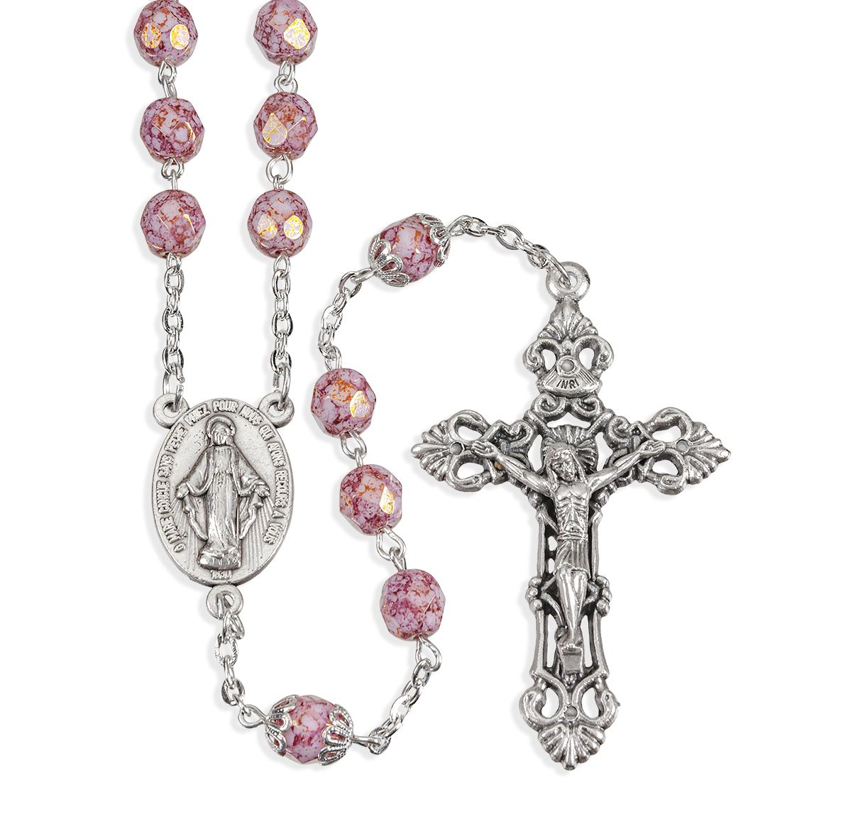 • 7mm Faceted Pink Alabaster Luster Glass Fire Polished Bead Rosary with Double Capped Our Father Beads.
